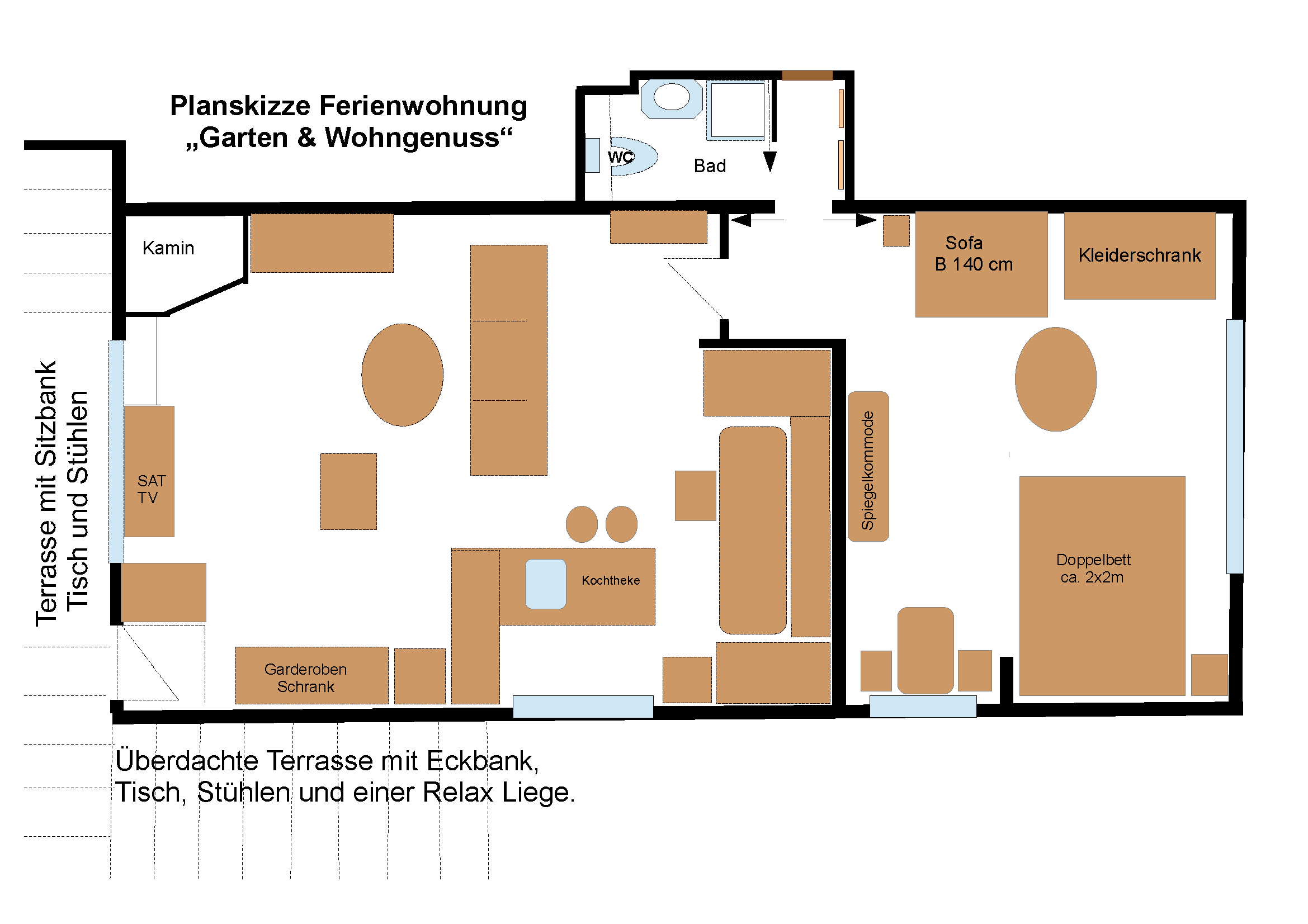 Die stilvolle, hochwertig möblierte Wohnung ist komplett ausgestattet und verfügt über eine zum Teil überdachte Terrasse mit Gartenmöbeln und Bänken im zauberhaften Garten. Ausstattung: Smart-TV, Klimaanlage im Wohn- und Schlafzimmer, Kühlschrank mit Gefrierfach, Spülmaschine, Geschirr, div. Haushaltsgeräte, Waschmaschine mit integr. Trockner, W-LAN, Telefon, Handtücher, Bett- und Tischwäsche.